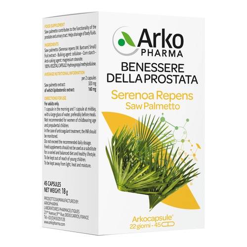 Serenoa RepensCAPSULE utile per il benessere dell'apparato urogenitale maschile. Inoltre, studi clinici dimostrano la sua efficacia nella cura della calvizie maschile. Posologia e Modalità d'uso: 1 o 2 Arkocapsule, 2 volte al giorno con un abbondante bicchiere d'acqua, preferibilmente prima dei pasti. Caratteristiche: ricchissima di acidi grassi e fitosteroli. E’ stata dimostrata l'efficacia sul trattamento dei sintomi della iperplasia prostatica benigna (ingrossamento della prostata). Vi sono anche trials clinici che dimostrano l'efficacia della Serenoa repens nella cura della calvizie maschile. Componenti: serenoa repens...